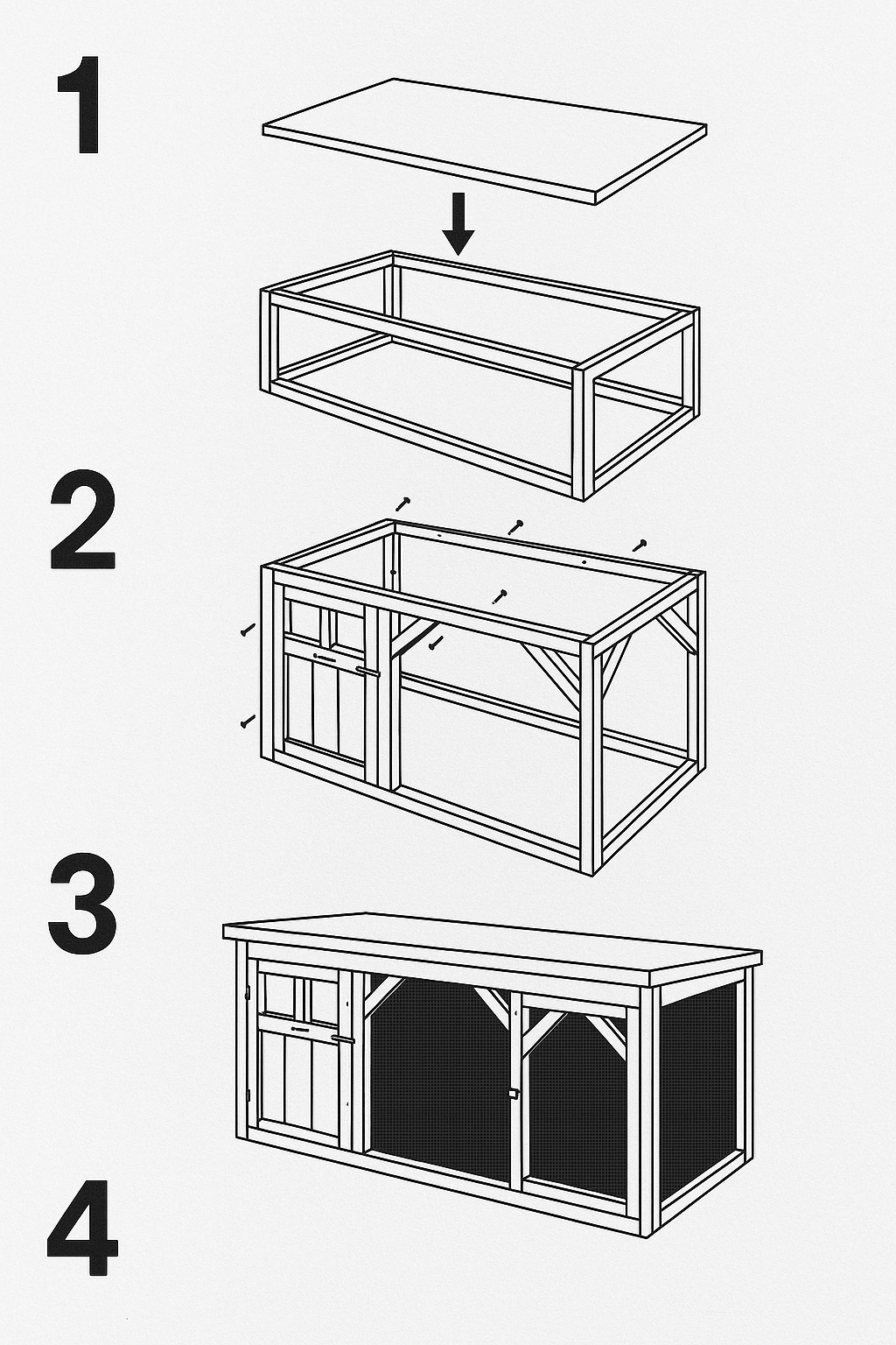 💡 Inclus avec votre achat : un kit de montage numérique (PDF), contenant toutes les instructions nécessaires pour assembler votre poulailler pas à pas. Aucun outil ni élément physique n'est envoyé – vous recevez un fichier téléchargeable immédiatement après achat, avec :