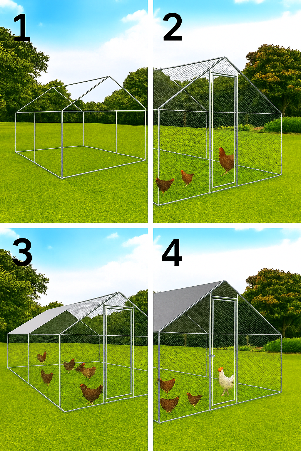 Ce kit est un document PDF numérique à télécharger, contenant toutes les instructions nécessaires pour assembler vous-même l’Enclos XXL pour Poules – un parc de 24m² conçu en acier galvanisé avec structure renforcée.