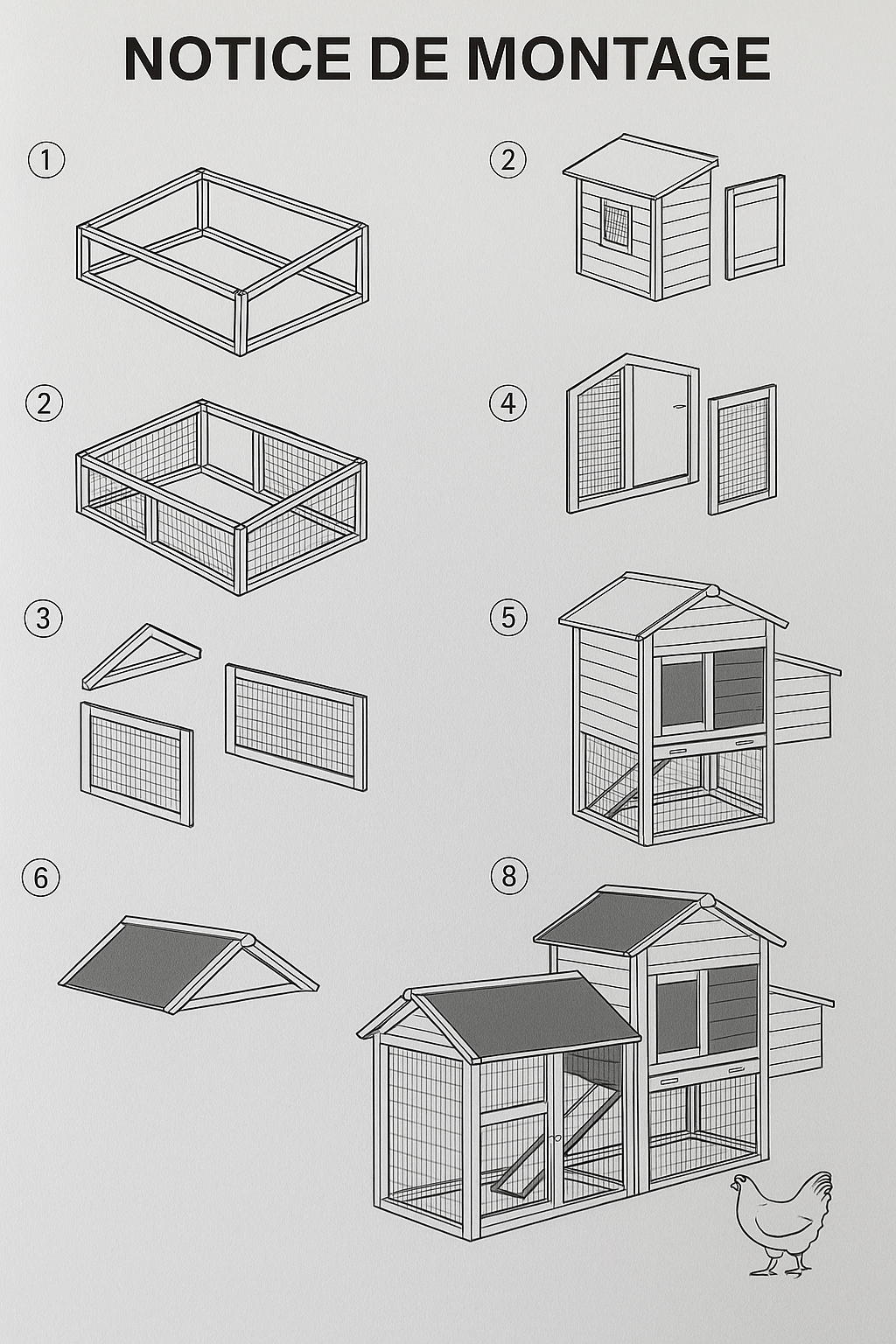 Vous avez choisi le poulailler Prestige Medium, un modÚle pratique, spacieux et idéal pour accueillir vos poules dans un cadre sécurisé ? Ce kit de montage visuel vous guide pas à pas pour un assemblage simple, rapide et sans outil compliqué.